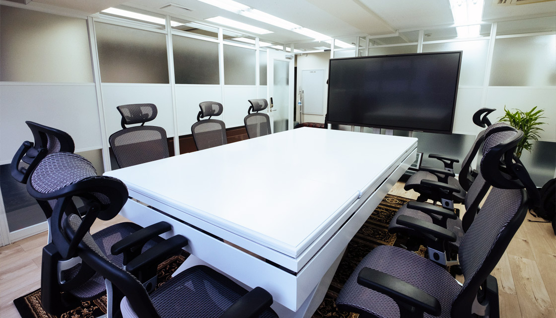 座りやすいメッシュの椅子でゆったりと会議ができます。86インチモニターを完備。サウンドにもこだわっており、映画やYouTubeを見る社員も? |
