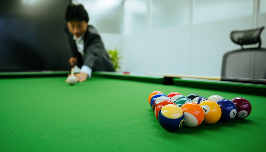 会議室のテーブルは、実はビリヤード台にもなるのです。ちょっとした気分転換にひと勝負はいかがでしょう。 |